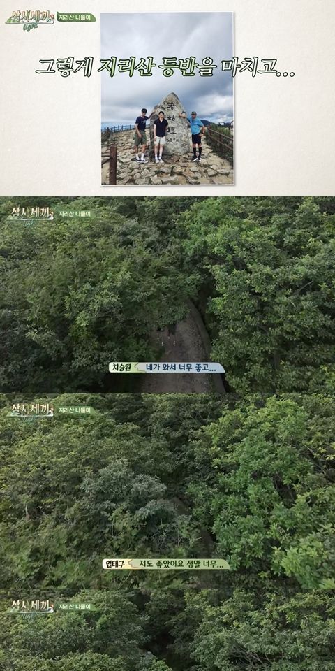 식사를 마친 후 세 사람은 노고단 등반에 나섰다. 특히 원래 등산을 싫어한다던 차승원은 정상에 도착해 "오기 잘 했다"라고 감격스러워했다.