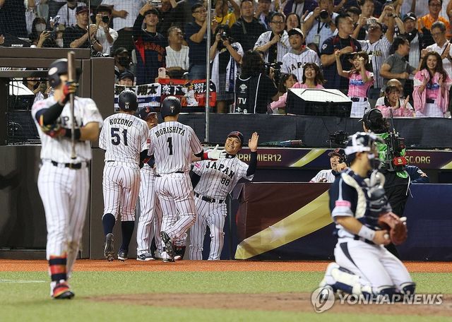 '좋았어'_(타이베이=연합뉴스) 한종찬 기자 = 15일 오후 대만 타이베이돔에서 열린 세계야구소프트볼연맹(WBSC) 프리미어12 2024 B조 조별리그 대한민국과 일본의 경기. 7회말 1사 1루에서 모리시타 쇼타가 투런 홈런을 치고 홈인한 뒤 이바타 히로카즈 감독과 하이 파이브를 하고 있다. 2024.11.15 saba@yna.co.kr