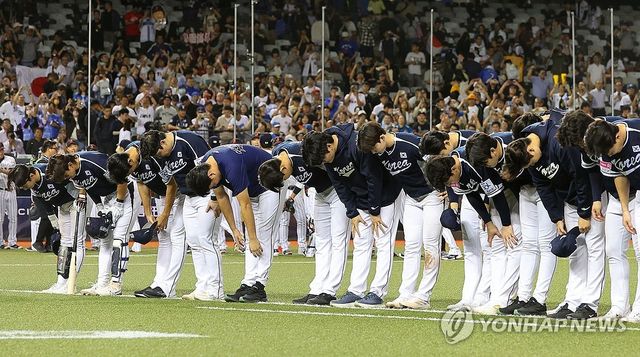일본에 패한 대한민국_(타이베이=연합뉴스) 한종찬 기자 = 15일 오후 대만 타이베이돔에서 열린 세계야구소프트볼연맹(WBSC) 프리미어12 2024 B조 조별리그 대한민국과 일본의 경기. 6-3으로 일본에 패한 대한민국 선수들이 인사하고 있다. 2024.11.15 saba@yna.co.kr