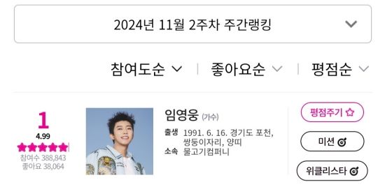 최근 아이돌차트에 따르면, 11월 8일부터 11월 14일까지 집계된 11월 2주 차 평점랭킹에서 임영웅은 38만 8,843표를 얻어 최다득표를 기록했다.