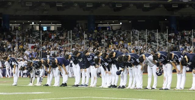 지난 15일(현지시간) 오후 대만 타이베이시 타이베이돔에서 열린 2024 WBSC 프리미어12 B조 예선 대한민국과 일본의 경기에서 3대 6으로 패한 대표팀 선수들이 그라운드에 서서 팬들에게 인사하고 있다. / 뉴스1