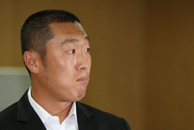 음주 물의를 빚은 정수근이 2009년 9월 3일 오후 강남구 도곡동 야구회관에서 열린 한국야구위원회 상벌위원회에 참석해 굳은 표정을 짓고 있다. / 연합뉴스