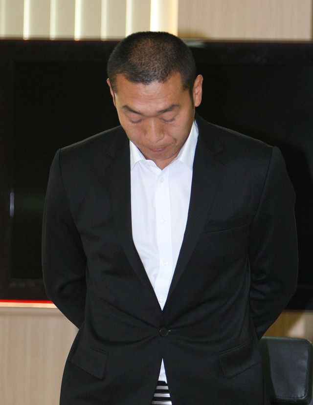 음주 물의를 빚은 정수근이 2009년 9월 3일 오후 강남구 도곡동 야구회관에서 열린 한국야구위원회 상벌위원회에 참석해 고개 숙여 인사를 하고 있다. / 연합뉴스