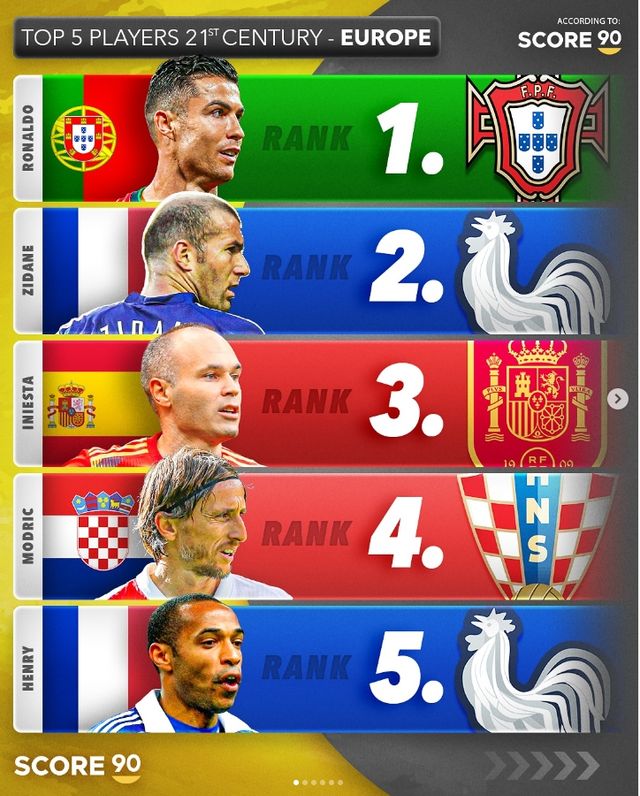 유럽에서는 차례대로 크리스티아누 호날두(포르투갈), 지네딘 지단(프랑스), 안드레스 이니에스타(스페인), 루카 모드리치(크로아티아), 그리고 티에리 앙리(프랑스)가 이름을 올렸다. 유럽에서는 수많은 축구 레전드들이 배출됐지만 21세기를 기준으로 했기 때문에 한때 리오넬 메시와 함께 쌍벽을 이뤘던 호날두가 1위로 선정된 것으로 보인다.
