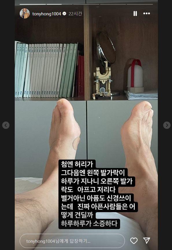 그는 발가락 통증을 고백했다. 홍석천은 "처음엔 허리가 아프더니 그다음엔 왼쪽 발가락이 아프고, 하루가 지나니 오른쪽 발가락도 아프고 저리다"라고 말했다.