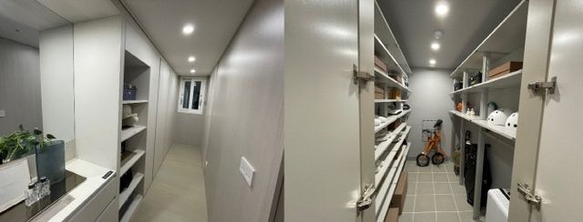 전용면적 84㎡ 타입의 안방 내부(좌)와 현관에 마련된 대형 팬트리(우). = 박선린 기자