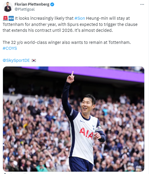 그는 “손흥민이 토트넘에 1년 더 머물 가능성이 높아지고 있다. 토트넘은 그의 계약을 2026년까지 연장하는 옵션을 발동할 것으로 예상된다. 이는 거의 확정된 상태”라고 전했다. 이어 “32세의 월드클래스 윙어인 손흥민 역시 토트넘에 남기를 원하고 있다”고 덧붙였다.