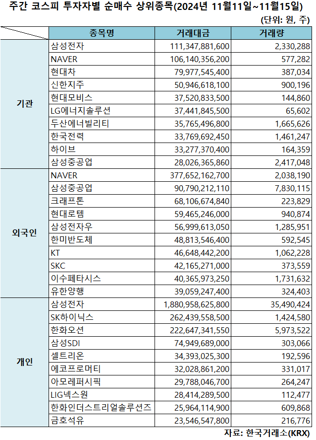 기관 '삼성전자'·외인 'NAVER'·개인 '삼성전자' 1위 [주간 코스피 순매수- 11월11일~11월15일]
