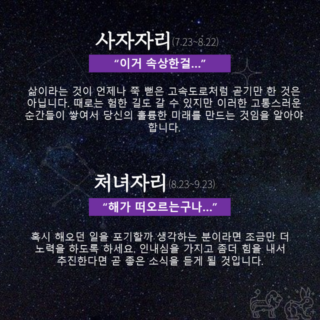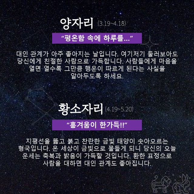 애정운도 나쁘지 않습니다. 하지만 커플이라면 인내와 희생이 필요한 날입니다. 자기 자신보다는 상대방에게 스케줄을 맞춰주도록 하세요. 당신의 배려가 둘 사이의 사랑을 더욱 깊게 만들어줄 것입니다.
