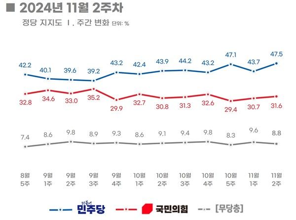 국힘 31.6%·민주 47.5%.. 양당 격차 13.0%P → 15.9%P
