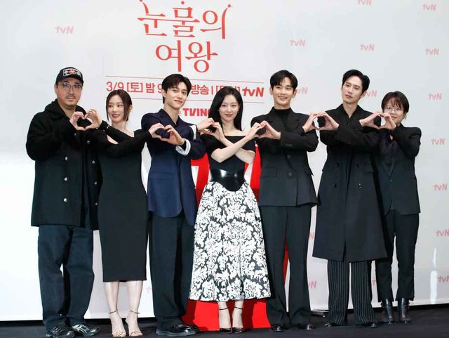 장영우 PD(왼쪽부터)와 배우 이주빈, 곽동연, 김지원, 김수현, 박성훈, 김희원 PD가 3월 7일 서울 구로구 라마다 신도림 호텔에서 진행된 tvN 새 토일드라마 '눈물의 여왕'(극본 박지은/연출 장영우, 김희원) 제작발표회에서 포즈를 취하고 있다. '눈물의 여왕'은 퀸즈 그룹 재벌 3세이자 백화점의 여왕 홍해인과 용두리 이장 아들이자 슈퍼마켓 왕자 백현우, 3년 차 부부의 아찔한 위기와 기적처럼 다시 시작되는 사랑 이야기를 담은 작품이다. / 뉴스1