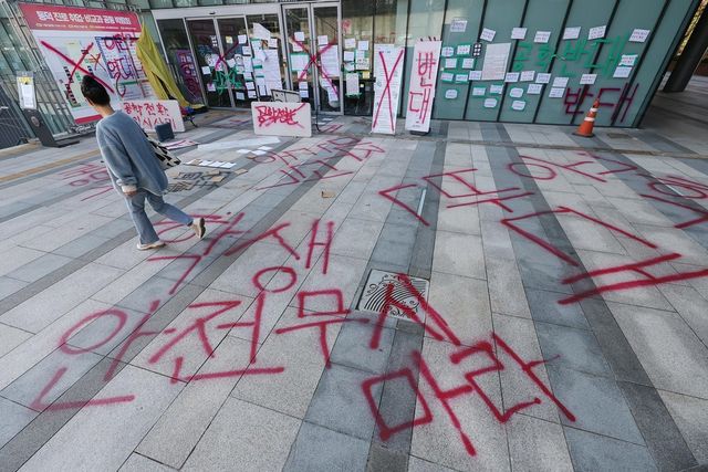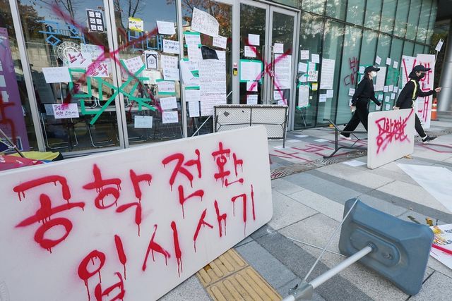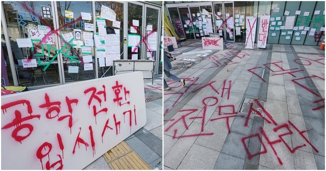 이하 동덕여대 백주년기념관에 학생들이 학교 측의 남녀공학 전환 논의를 규탄하며 붉은색 래커 스프레이로 적은 항의 문구가 선명히 남아 있다. / 뉴스1
