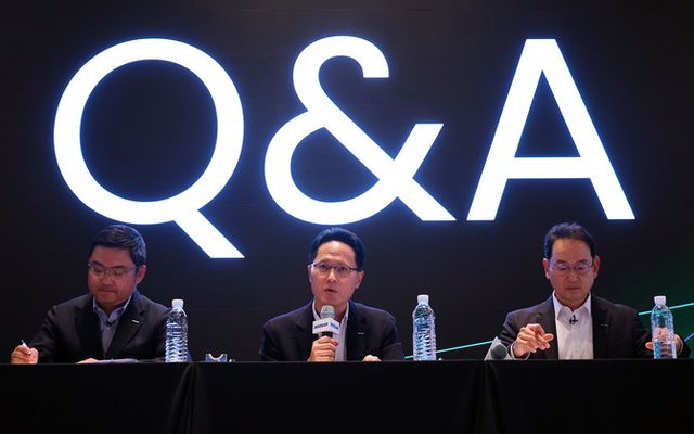 박상현 두산에너빌리티 대표가 지난 10월21일 오후 서울 중구 플라자호텔에서 열린 두산에너빌리티-두산로보틱스 분할합병 건 기자간담회에서 취재진 질문에 답하고 있다. 왼쪽부터 류정훈 두산로보틱스 대표, 박 대표, 스캇 박 두산밥캣 부회장. ⓒ 연합뉴스
