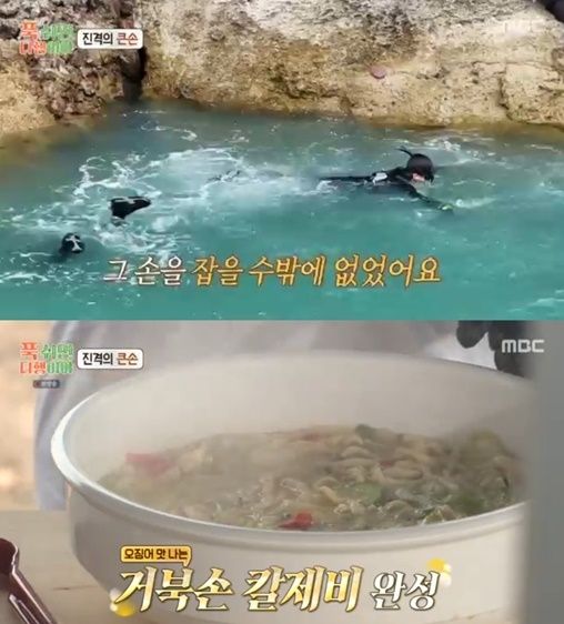 김대호, 장준 머구리가 결국 바다에 입수했고, 갯바위에서 박세리, 김민경은 낚시로 식재료 포획에 나섰다. 메인 식재료로 거북손을 맞이하게 된 박세리는 “날씨도 흐리고 비도 살짝 오는데, 이런 날 칼국수, 수제비도 먹고 싶다”라며 칼제비를 메뉴로 선정했다.