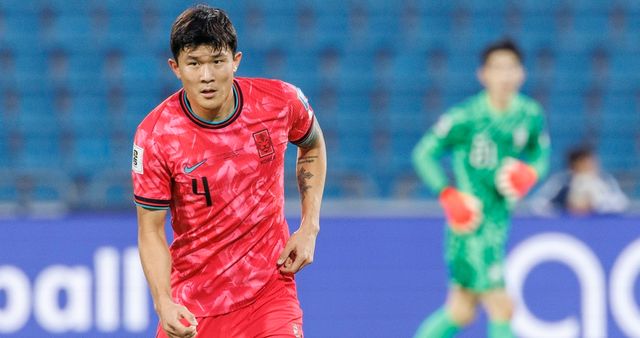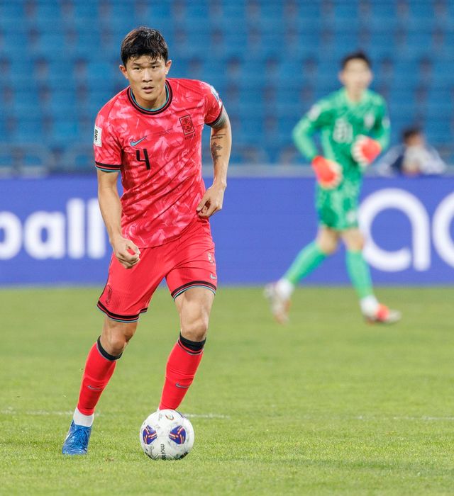 19일 오후(현지 시각) 요르단 암만 국제경기장에서 열린 2026 북중미 월드컵 아시아 3차 예선 B조 한국과 팔레스타인의 경기에서 한국의 김민재가 중원으로 전진하고 있다. / 연합뉴스