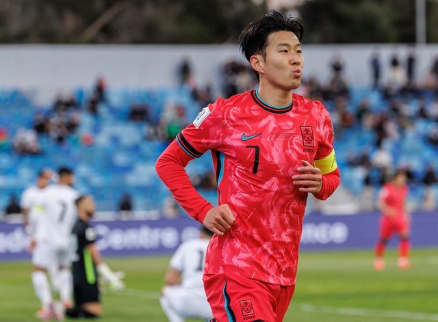 19일 오후(현지 시각) 요르단 암만 국제경기장에서 열린 2026 북중미 월드컵 아시아 3차 예선 B조 한국과 팔레스타인의 경기에서 한국의 손흥민이 동점 골을 넣은 뒤 행진하고 있다. / 연합뉴스