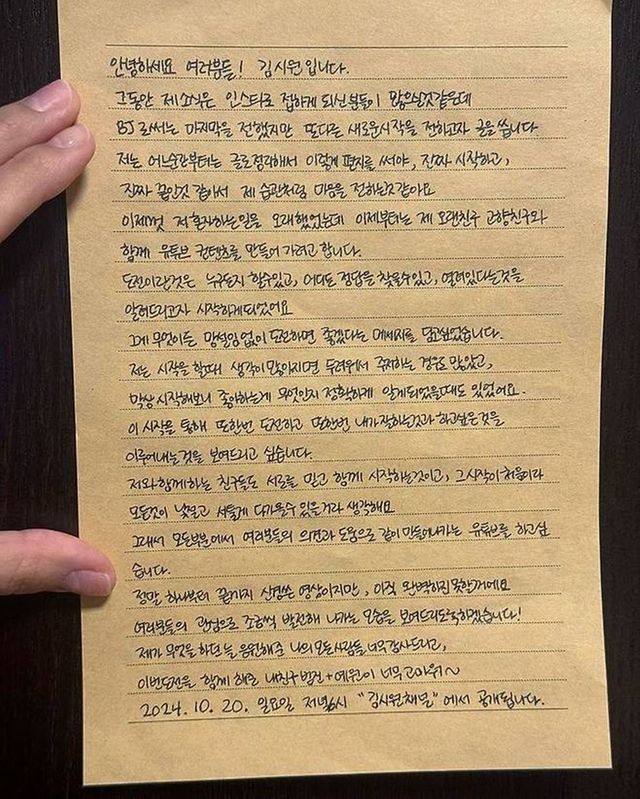 김시원은 편지에서 "마지막 방송이란 말도 웃기고, 끝을 애써 정하는 게 말도 안 된다고 생각하지만 이렇게 끝을 내게 됐다"며 "어떠한 이유가 겹치고 겹치다 보니 너무 많은 일이 한꺼번에 일어나서 제가 좀 많이 지친 것 같다"고 전했다.