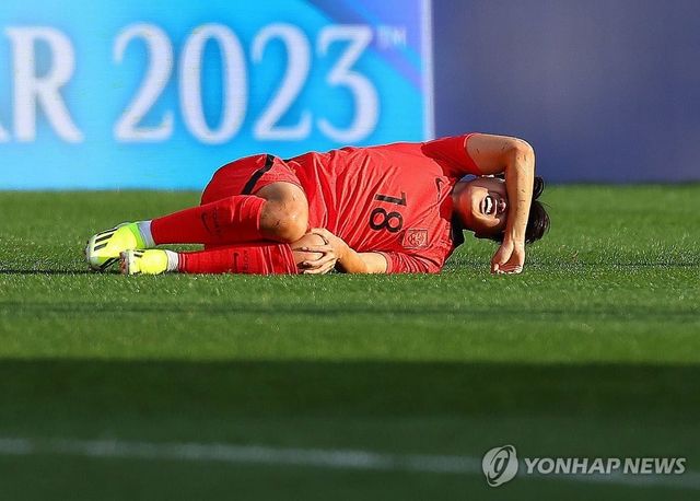 지난 1월 15일(현지시간) 카타르 도하 자심 빈 하마드 스타디움에서 열린 2023 아시아축구연맹(AFC) 아시안컵 조별리그 E조 한국과 바레인의 경기. 이강인이 상대 선수와 부딪힌 뒤 과거 부상을 입은 적 있는 왼쪽 무릎에 통증을 호소하고 있다. / 연합뉴스