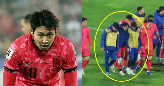 팔레스타인전 경기 종료 후 무릎에 아이싱을 한 채 동료들에게 부축받으며 퇴장하는 이강인의 모습이 포착됐다.