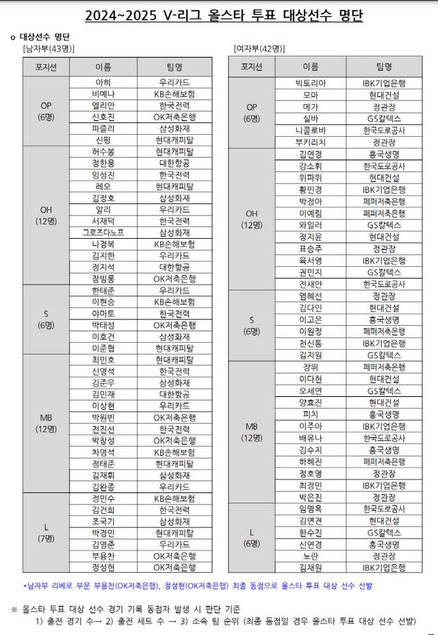 한국배구연맹(KOVO)은 내년 1월 4일 개최되는 2024~25 V리그 올스타전 출전 선수 온라인 팬 투표를 재실시한다고 20일 밝혔다. 기간은 이날 오후 4시 27일 오후 2시까지 8일간이다.