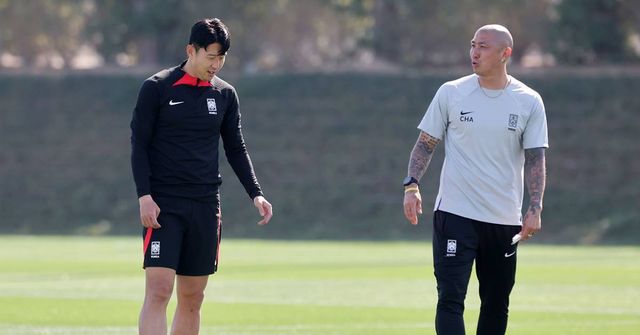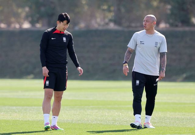 2023 아시아축구연맹(AFC) 카타르 아시안컵에 출전 중인 대한민국 축구대표팀 손흥민과 차두리 코치가 지난 1월 24일(현지시간) 카타르 도하 알 에글라 트레이닝 센터에서 대화하고 있다 / 뉴스1