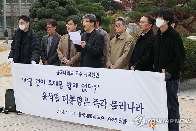 동국대학교 교수들이 21일 서울 중구 동국대에서 시국선언을 하고 있다. / 연합뉴스