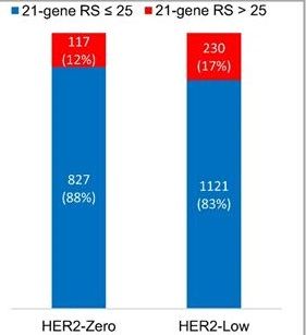 HER2-zero 그룹과 HER2-low 그룹 간의 고위험 RS 비율을 비교한 결과에서는 HER2-zero 그룹에서는 고위험 RS 비율이 12.4% (944명 중 117명)이었고, HER2-low 그룹에서는 고위험 RS 비율이 17.0% (1351명 중 230명)로 나타나 통계적으로 유의미한 결과를 보였다 (p값 = 0.002). (그림1 참조)