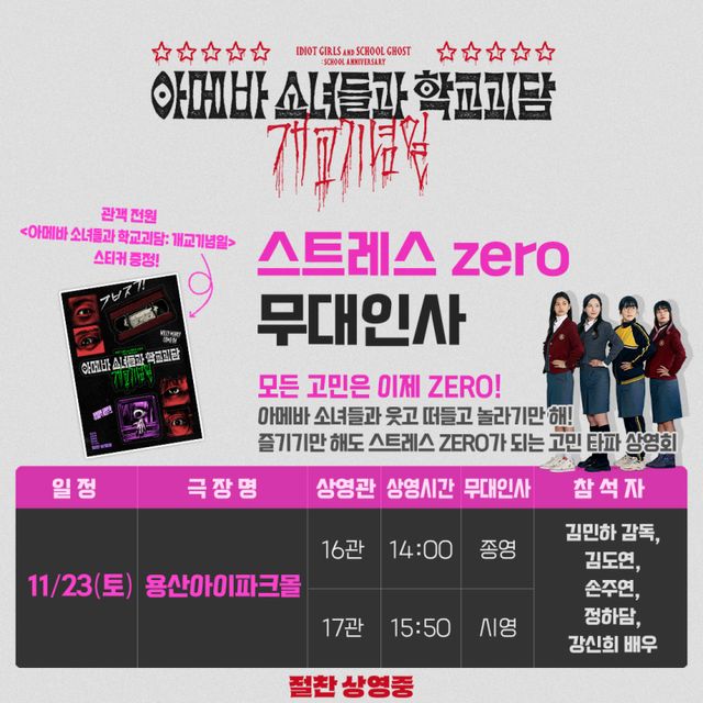 수능 만점을 위해 고3들이 괴담에 도전한다는 소재로 ‘MZ 호러 코미디’를 표방하며 지난 6일 CGV 단독 개봉한 ‘아메바 소녀들과 학교괴담-개교기념일’은 2만 관객을 돌파하는 저력을 발휘한 가운데, 10대 관객 비율은 5.8%를 기록 중이다. 한때는 6.5%에 달하기도 했으며, 주말인 23일에는 수험생들의 긴장감을 풀어주기 위해 김도연을 비롯한 주연배우 모두가 참석하는 ‘스트레스 ZERO’ 무대인사도 2회차 진행될 예정으로 예매율 상승을 기대 중이다.