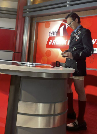 사진 속 지드래곤은 뱃지와 옷핀으로 키치하게 꾸며진 검은색 재킷에 블루 스트라이프 셔츠와 넥타이, 포마드 헤어와 뿔테 안경을 매치해 세련되게 꾸몄다.