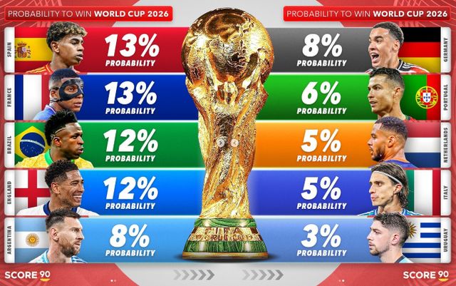 글로벌 매체 '스코어90'은 21일(한국시간) 사회관계망서비스(SNS)를 통해 "배팅업체의 배당률에 따라 2026 월드컵 우승 가능성"이라며 월드컵 우승 후보들의 우승 확률을 공개했다.