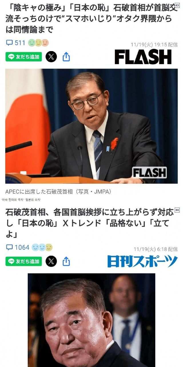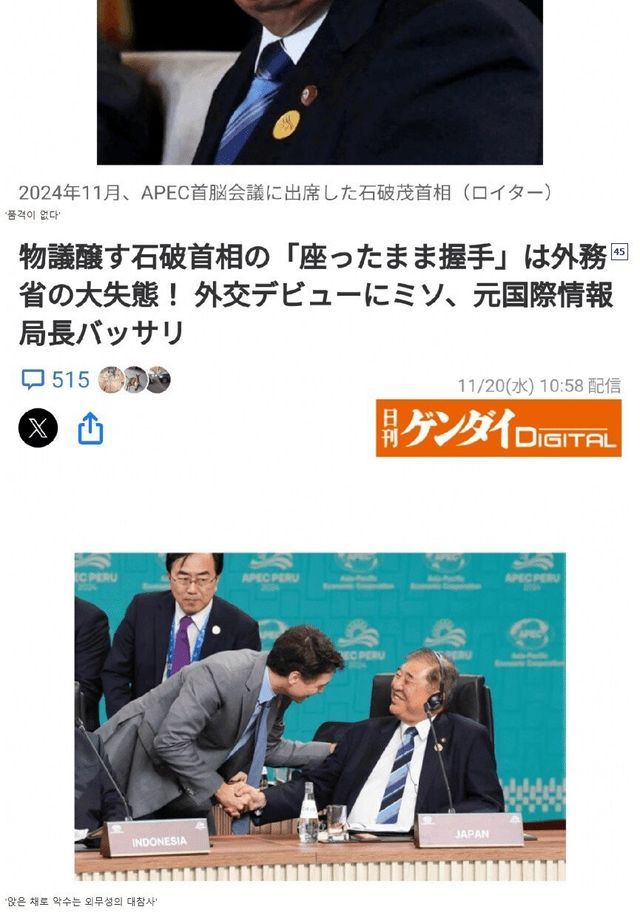 전통 공연 보는데 팔짱 끼고 있고 진핑이랑 악수 하는데 두손으로 잡았다고 외교 의전 미숙이라고 일본 언론에서 극딜중