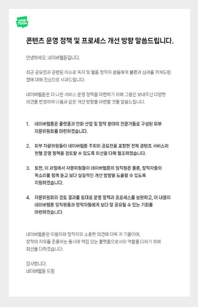 네이버웹툰은 이날 별도의 공지를 통해 이번 사태에 대한 입장을 밝혔다. 네이버웹툰은 “최근 공모전과 관련된 이슈로 독자 및 웹툰 창작자 분들에게 불편과 심려를 끼쳐드린 점에 대해 진심으로 사과드린다”고 밝혔다.