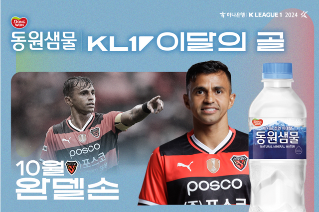 포항 완델손이 2024시즌 10월 K리그 ‘마시는 천연 미네랄 동원샘물 이달의 골’을 수상했다.