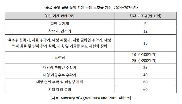 농기계 구매 보조금으로 중국 정부는 올해 기준 246억의 특별 자금을 마련할 것이라고 발표했다. 새로운 농기계 보조금은 25개 대분류, 55개 카테고리, 154개 품목을 대상으로 하며, 이전 정책에 비해 10개 대분류, 11개 카테고리, 18개 품목이 새로 추가됐다. 품목에 따라 최대 구매 보조금 기준은 대당 5~60만 위안이다. (대당 7000~8만5000달러)