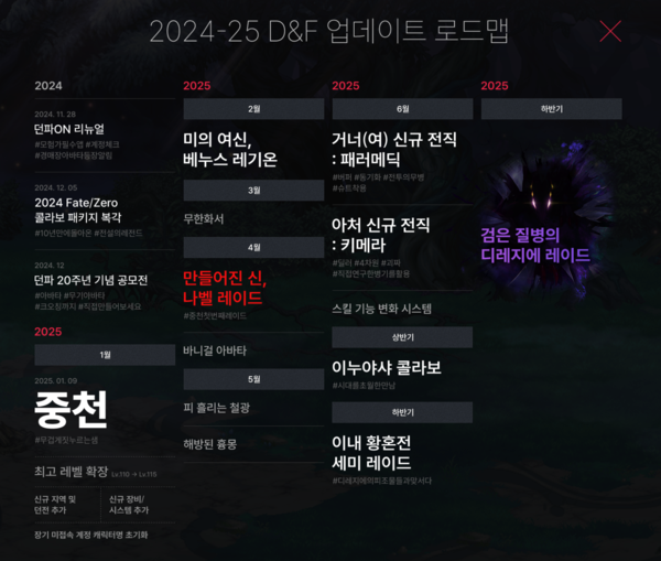 오는 2025년 1월 ‘던전앤파이터(이하 던파)’의 새 시대가 열린다. 넥슨은 22일 일산 킨텍스 제2전시장에서 ‘2024 던파 페스티벌’을 개최, 내년 1월 진행될 신규 시즌 ‘중천’ 업데이트를 중심으로 11월 28일부터 내년 상반기까지 이어질 주요 업데이트 계획을 밝혔다.