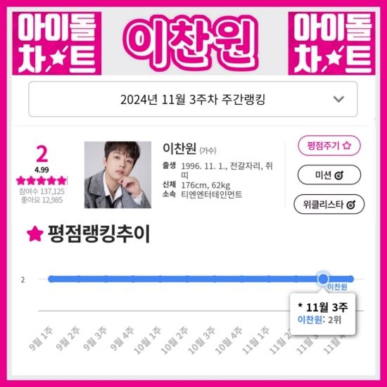 (엑스포츠뉴스 이정범 기자) '찬또배기' 이찬원이 11월 3주 차 아이돌차트 평점 랭킹 2위에 올랐다.