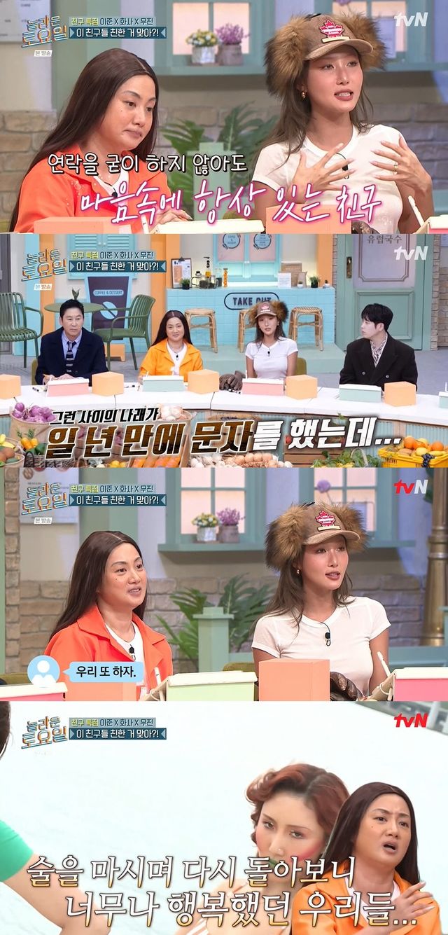 이어 화사는 박나래에게서 1년 만에 '우리 또 하자'라는 주어가 없는 메시지를 받았다며 에피소드를 공개했다. 박나래는 "한혜진, 화사와 하던 '여은파' 단톡방이 있다. 1년 만에 갑자기 영상을 보니까 너무 좋더라. 아무 말 다 빼고 '우리 또 하자. 여은파 뭉치자'고 말했다"고 당시 상황을 설명했다.