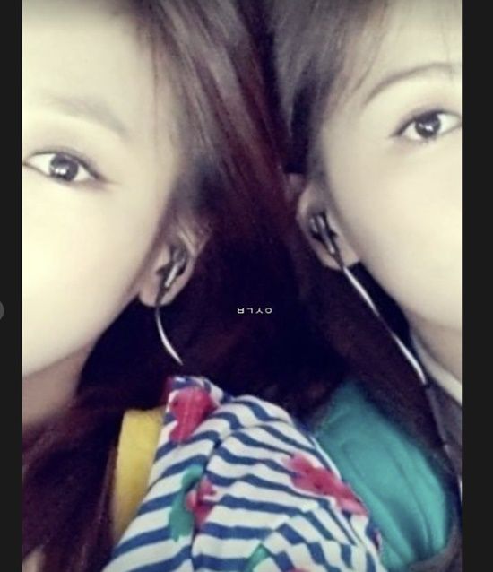 공개된 사진에는 강지영과 구하라의 어린 시절 모습이 담겨 있다. 두 사람은 나란이 이어폰을 꽂은 채 쌍둥이처럼 꼭 닮은 미모를 뽐내고 있다.