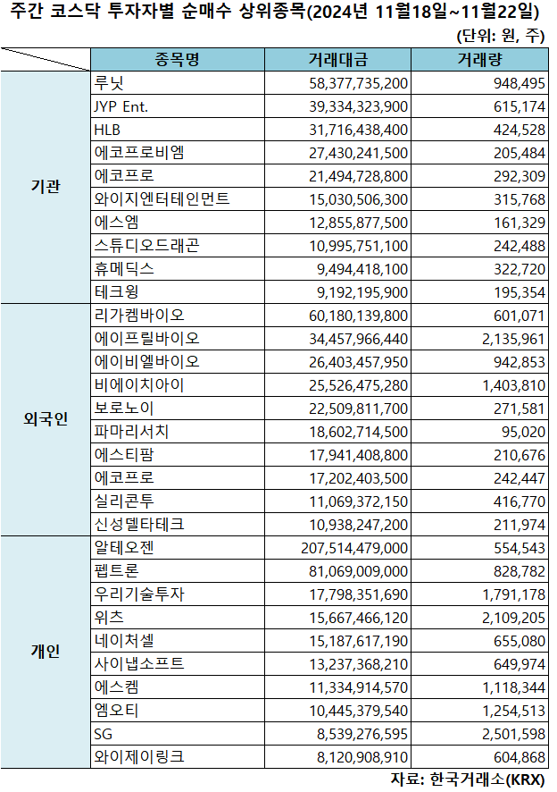 기관 '루닛'·외인 '리가켐바이오'·개인 '알테오젠' 1위 [주간 코스닥 순매수- 11월18일~11월22일]