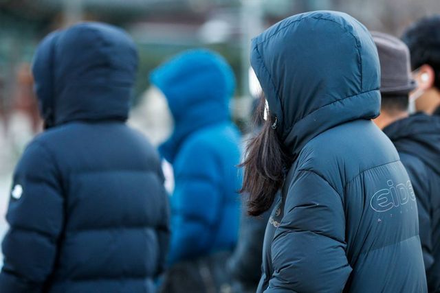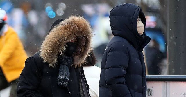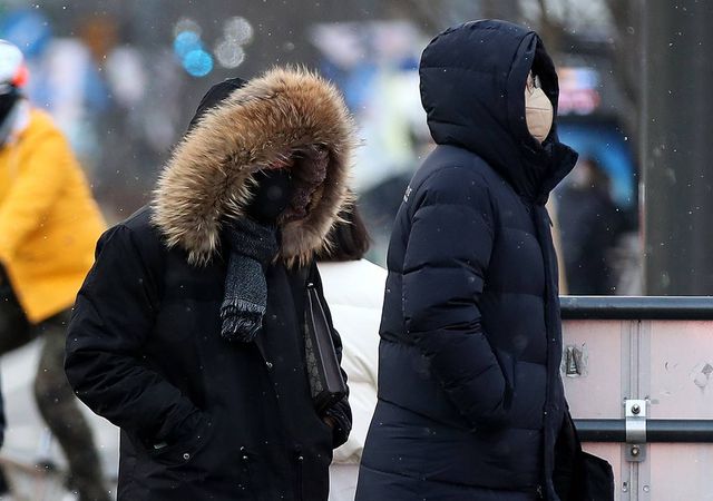 추위에 모자 뒤집어 쓴 시민들. / 뉴스1