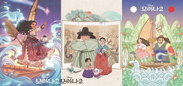 이 가운데 일러스트레이터 김스타, 르빈치 작가와 한국화가 곽수연의 콜라보로 탄생한 스페셜 한국화 포스터 3종이 공개돼 예비 관객들의 마음을 설레게 하고 있다. 이번 포스터는 한국의 전통적인 아름다움을 살린 드로잉과 색채에 각 작가들마의 개성이 더해져 소장 욕구를 드높인다. 먼저 김스타 작가의 포스터는 별이 쏟아지는 밤하늘과 출렁이는 푸른 바다를 배경으로, 고대 섬을 향한 모아나의 여정을 당당하게 그려내 시선을 압도한다. 르빈치 작가는 ‘일월오봉도’를 연상시키는 전통적인 배경에 노를 들고 있는 ‘모아나’와 조선시대 군복을 입고 늠름한 포즈를 취하는 ‘마우이’가 어우러져 이색적인 분위기를 뽐낸다. 여기에 귀여운 씬스틸러 ‘푸아’와 ‘헤이헤이’, 그리고 ‘카카모라’까지 총출동해 귀여움을 배가시킨다. 마지막으로 곽수연 작가의 포스터는 고풍스러운 매력이 돋보인다. ‘모아나’의 이름이 대양이라는 뜻을 가진데에 착안한 그는 스스로를 믿는 항해자인 ‘모아나’의 용기 있는 여정 뿐만 아니라 ‘모아나’와 애틋한 자매 케미를 선보이는 동생 ‘시메아’도 등장시켜 마치 한국의 명절처럼 따뜻하고 정겨운 분위기를 자아낸다.