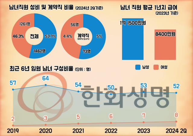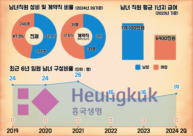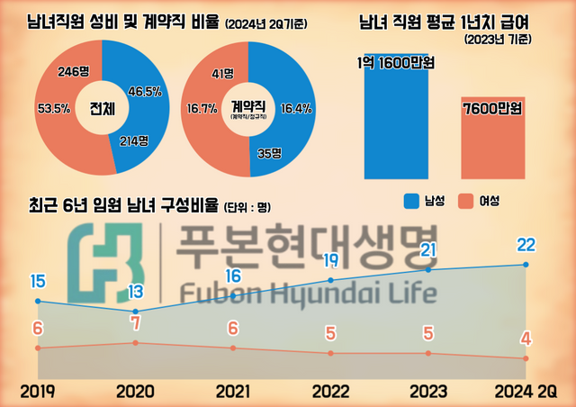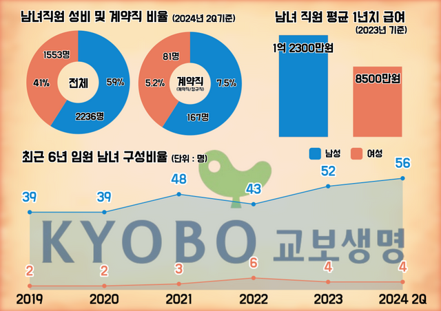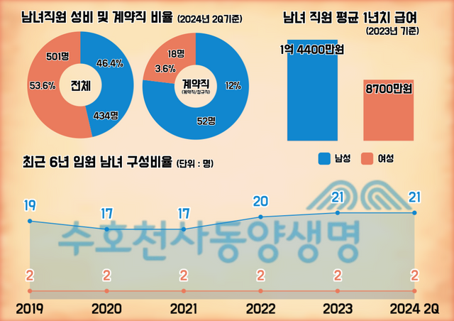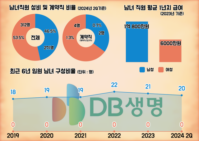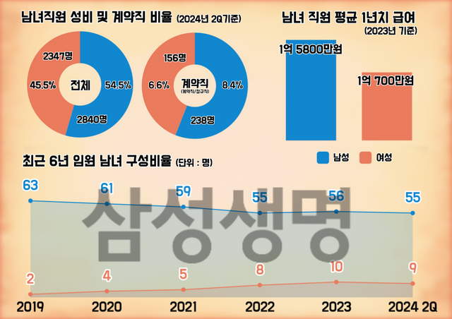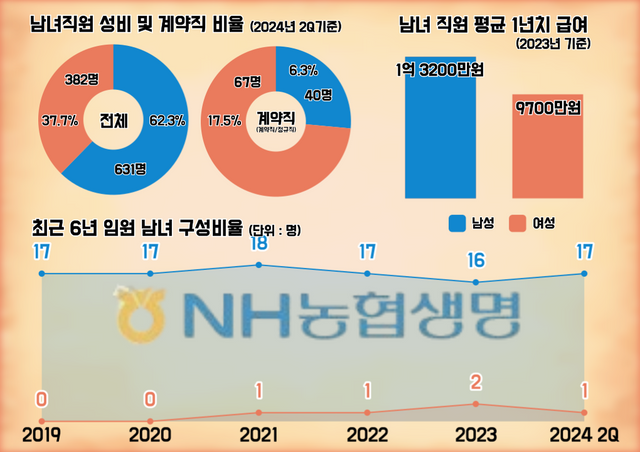 NH농협생명이 17.5%로 여성 계약직 비율이 가장 높았으며, 지난해 기준 동양생명이 5700만원으로 가장 큰 남녀 임금격차를 보였다.
