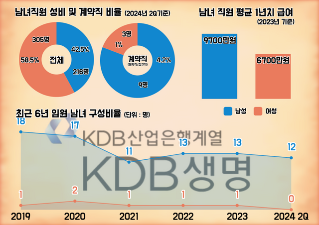 올해 반기기준 전체 인원 대비 가장 많은 여성직원을 고용한 생명보험사는 KDB생명(58.5%), 여성 임원 비율이 가장 높은 보험사는 ABL생명(22명 中 5명)이 차지했다.