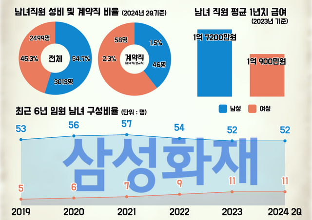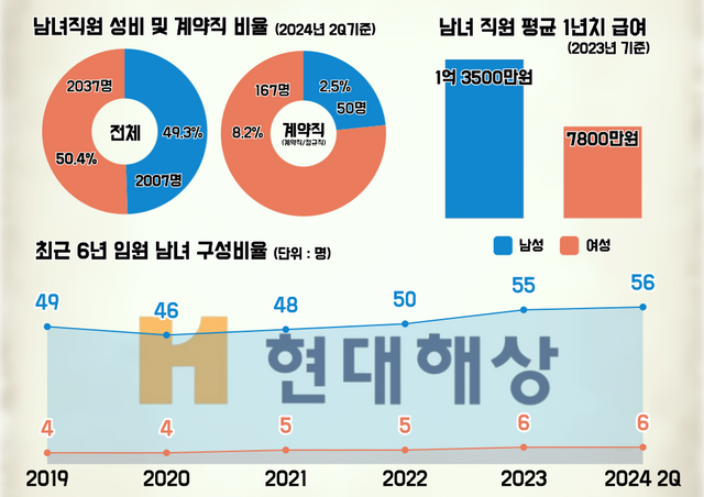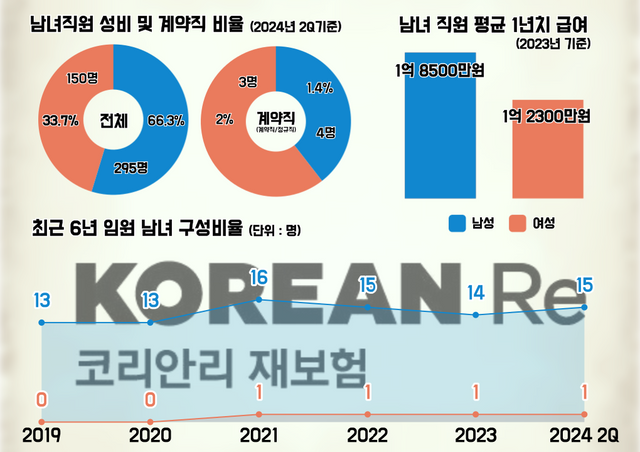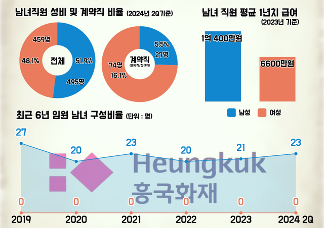NH농협손해보험이 31.6%로 여성 계약직 비율이 가장 높았으며, 지난해 기준 메리츠화재가 7100만원으로 가장 큰 남녀 임금격차를 보였다.