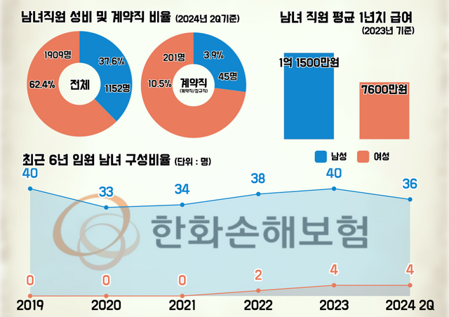 올해 반기기준 전체 인원 대비 가장 많은 여성직원을 고용한 손해보험사는 한화손해보험(62.4%), 여성 임원 비율이 가장 높은 보험사는 삼성화재(63명 中 11명)가 차지했다.