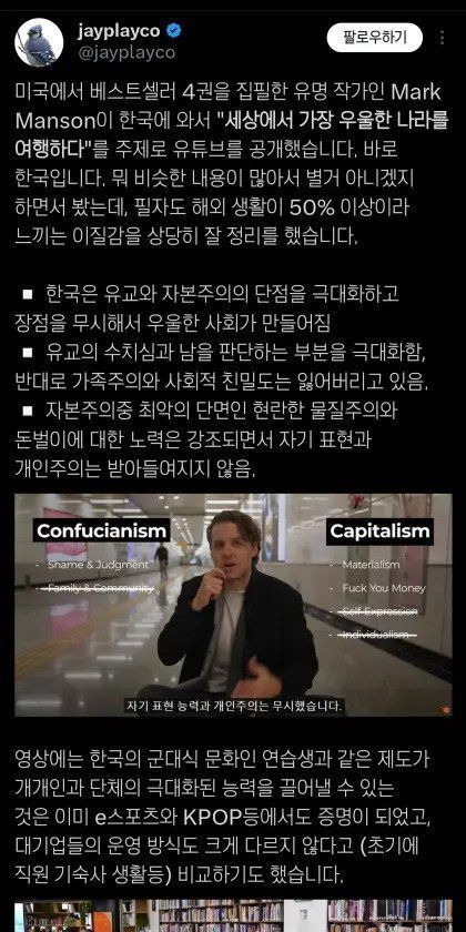 유교의 단점(타인의 시선에 대한 눈치, 체면)과 자본주의의 단점(물질주의,한탕주의)만 남아 결합되면서