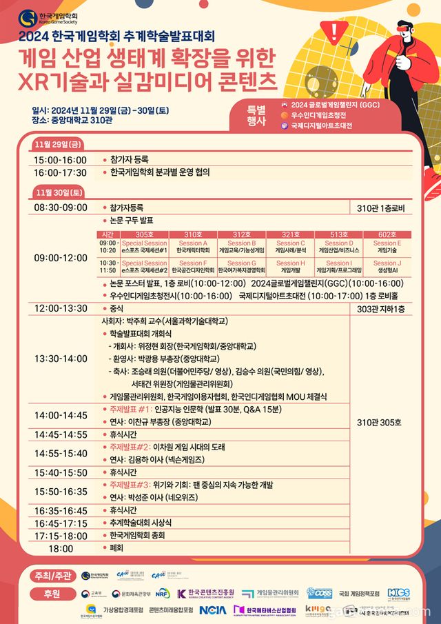 한국게임학회는 오는 30일 중앙대학교 100주년 기념관에서 2024 한국게임학회 추계학술발표대회를 GGC(글로벌 게임 챌린지)와 함께 개최한다.