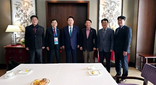 | ▲ 주낙영 시장을 비롯한 경주시 대표단이 17일 오전(현지 시간), 페루 리마 웨스틴호텔에서 윤석열 대통령 예방한 후 기념 촬영을 하고 있다. |