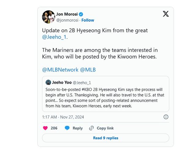 MLB 네트워크 존 모로시, MLB닷컴 마크 페인샌드는 아메리칸리그(AL) 서부지구 시애틀 매리너스가 김혜성에게 관심이 있다고 전했다. 모로시는 개인 소셜미디어(SNS)에 김혜성의 포스팅 신청과 미국행 소식을 전하기도 했다.