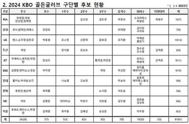 통합 우승을 달성한 KIA와 지난해 우승팀 LG가 가장 많은 후보 10명을 배출했다. 한화에선 가장 적은 5명의 후보가 나오는 데 그쳤다.